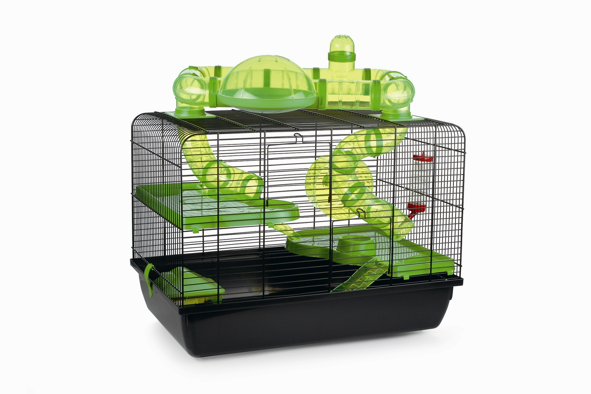 Inclusief platform, looprad, fel groen transparant buizensysteem, drinkflesje en voederbakje.